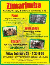 The University of Washington School of Music presents a celebration of Zimbabwean music at the UW on Friday, Feb. 21, 2014, 4:30 to 9 p.m. A concert by Afropop group Ruzivo at 7:30 pm in Brechemin Auditorium wraps up the celebration.