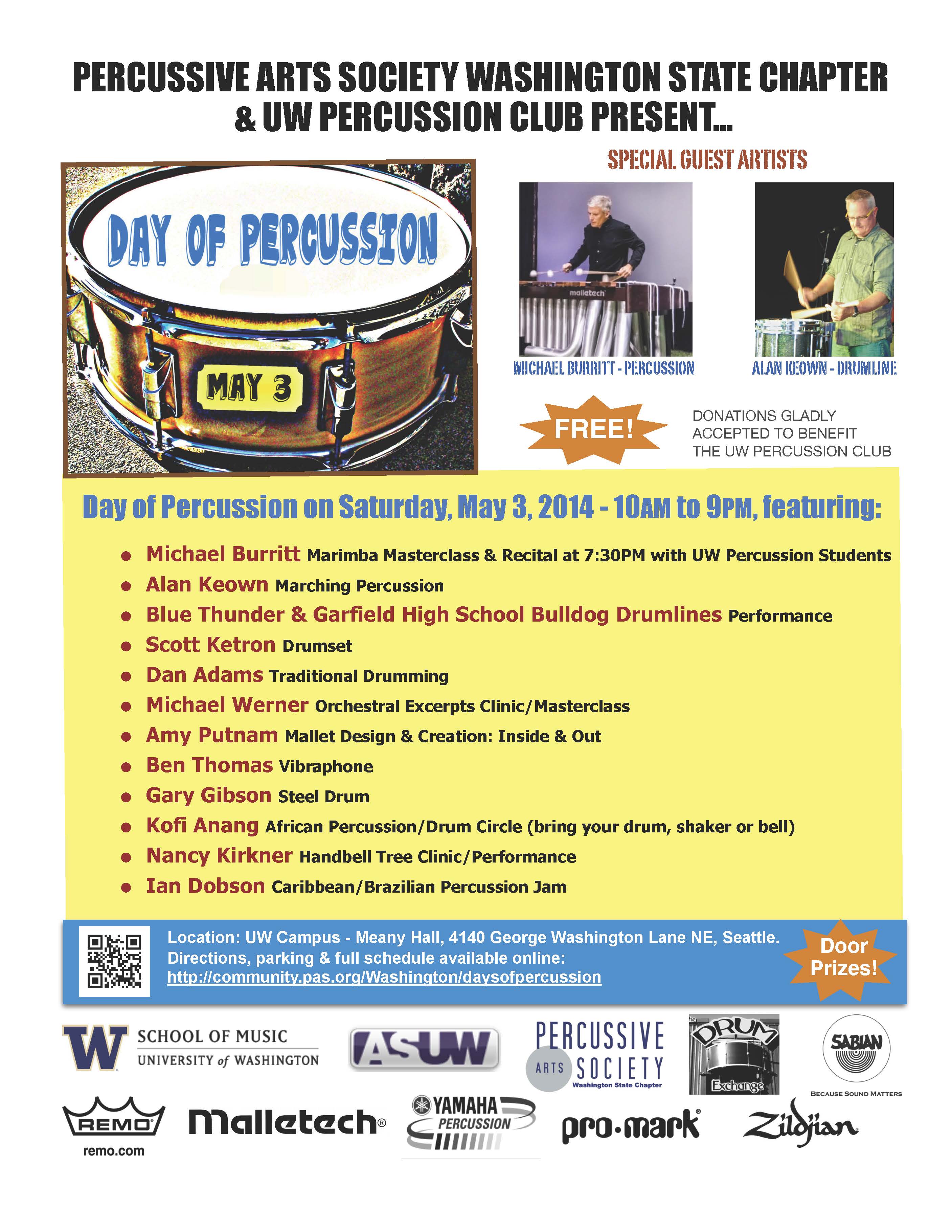 Day of Percussion, organized by students from the UW Percussion Studio and sponsored by the UW School of Music, Percussive Arts Society, UW Percussion Club, The Drum Exchange, Sabian, YAMAHA, Malletech, Zildjian, Remo, Evans, DW, Black Swamp Percussion, Grover Percussion, and Offworld Percussion, will include master classes, performances, and other activities.