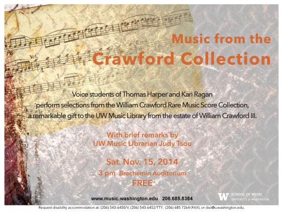 The UW Music Library received a generous bequest in 2014 from New York resident William Crawford III of a collection of rare musical scores. The collection includes about 720 items of mostly first edition, first printing of vocal music from Henry Purcell (1697), to György Ligeti (1978), and beyond. In this free concert, Voice students of Thomas Harper and Kari Ragan perform selections from the collection.