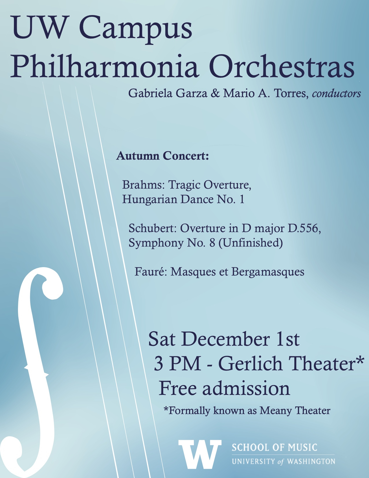 The UW Campus Philharmonia Orchestras (Gabriela Garza and Mario A. Torres, conductors) present their Autumn 2018 concert, performing works by Schubert, Brahms and Fauré.
