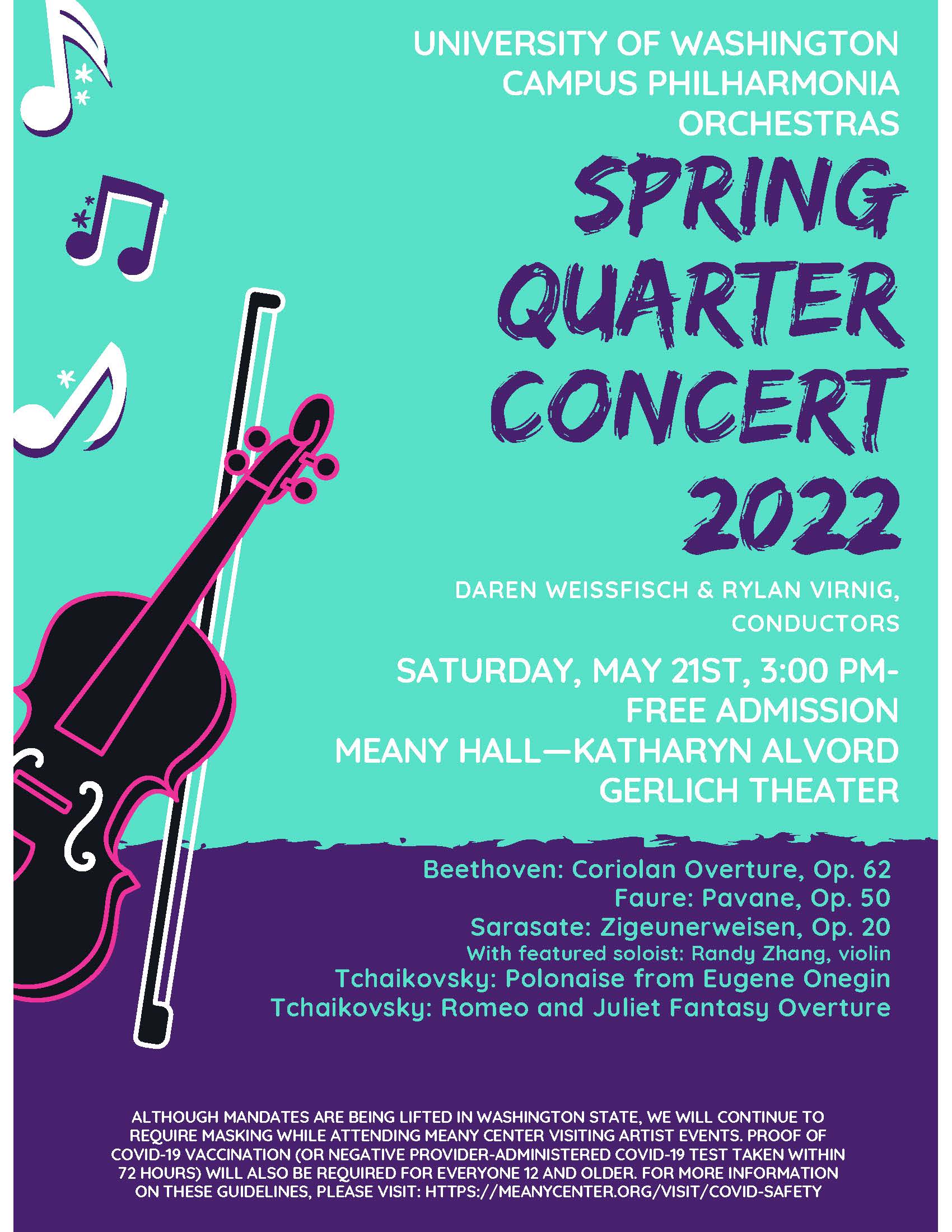 Masks are recommended in all indoor spaces. Proof of vaccination remains a requirement for everyone 12 and over at Meany Hall and all ArtsUW Ticket Office events, including Meany Center, DXARTS, Dance Department, School of Drama, and School of Music. Individuals unable to be fully vaccinated, including people with a medical or religious exemption, must have proof of a negative provider-administered COVID-19 test (taken within 72 hours of the performance). UW staff will check for proof of vaccination and negative COVID tests at the doors as a condition of entry. Proof of negative test result must come from a test provider, a laboratory or a health care provider. Home or self-administered tests will not be accepted. Details of these policies and procedures are at: https://artsevents.washington.edu/covid-protocols