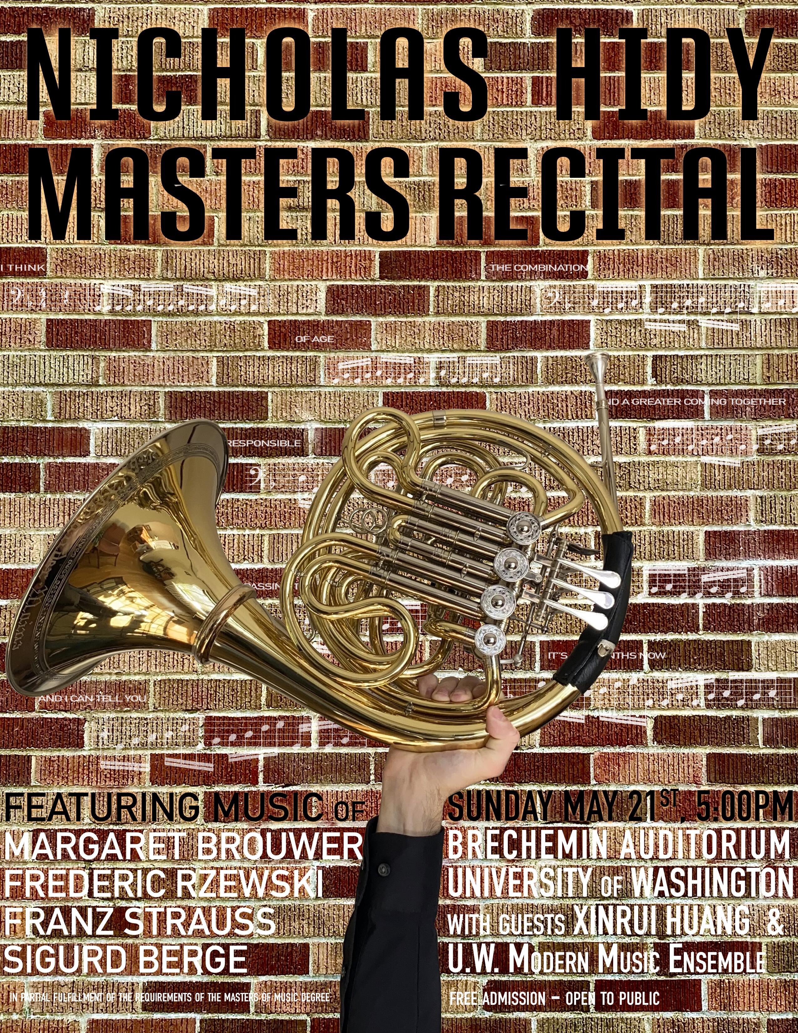 A degree recital by Nicholas Hidy, MM Horn Performance, a student of John Turman. With Xinrui Huang and the UW Modern Music Ensemble.