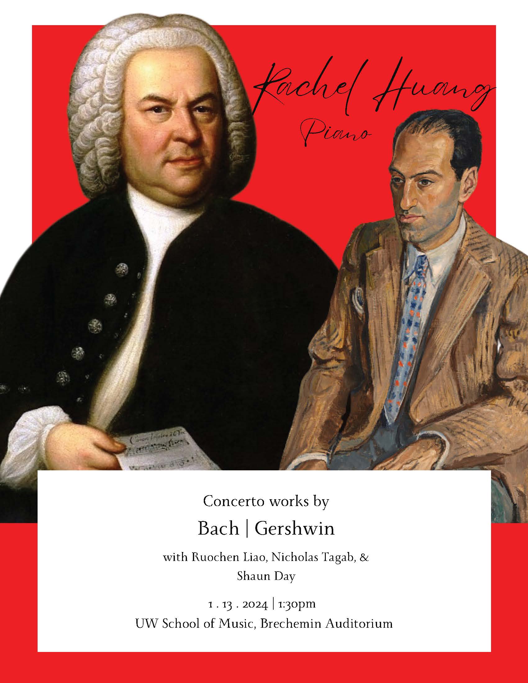 A degree recital by Rachel Huang, piano, a DMA student of Robin McCabe, performing works by J.S. Bach and George Gershwin. With Ruochen Liao and Nicholas Tagab, piano; and Shaun Day, trumpet.
