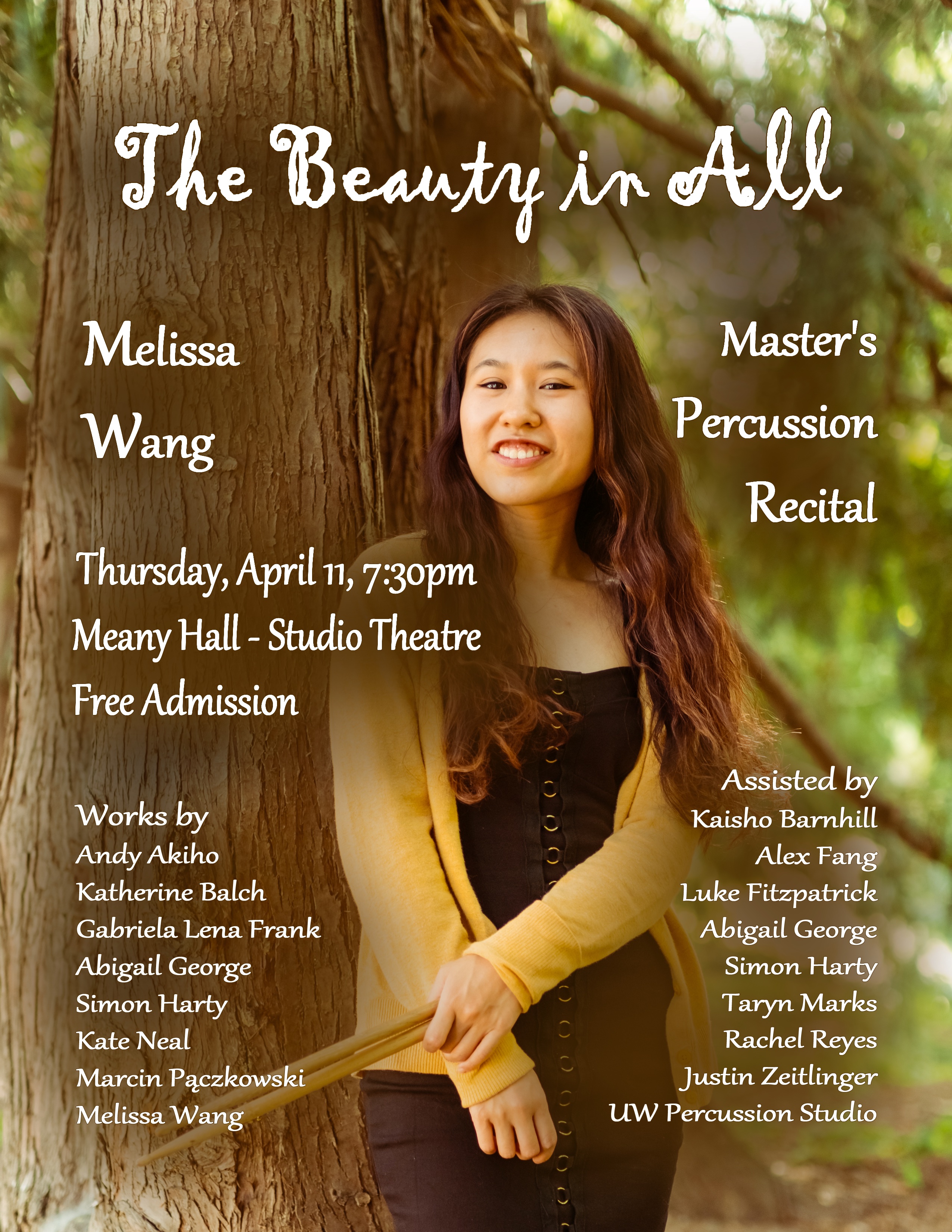 Melissa Wang (MM Percussion Studies, MM Composition), a student of Bonnie Whiting and Huck Hodge, presents "The Beauty in All," a recital presented in partial fulfillment of the requirements for the Master of Music Degree in Percussion Performance at the University of Washington. With Kaisho Barnhill, Alex Fang, Luke Fitzpatrick, Abigail George, Simon Harty, Taryn Marks, Rachel Reyes, Justin Zeitlinger, and the UW Percussion Ensemble.