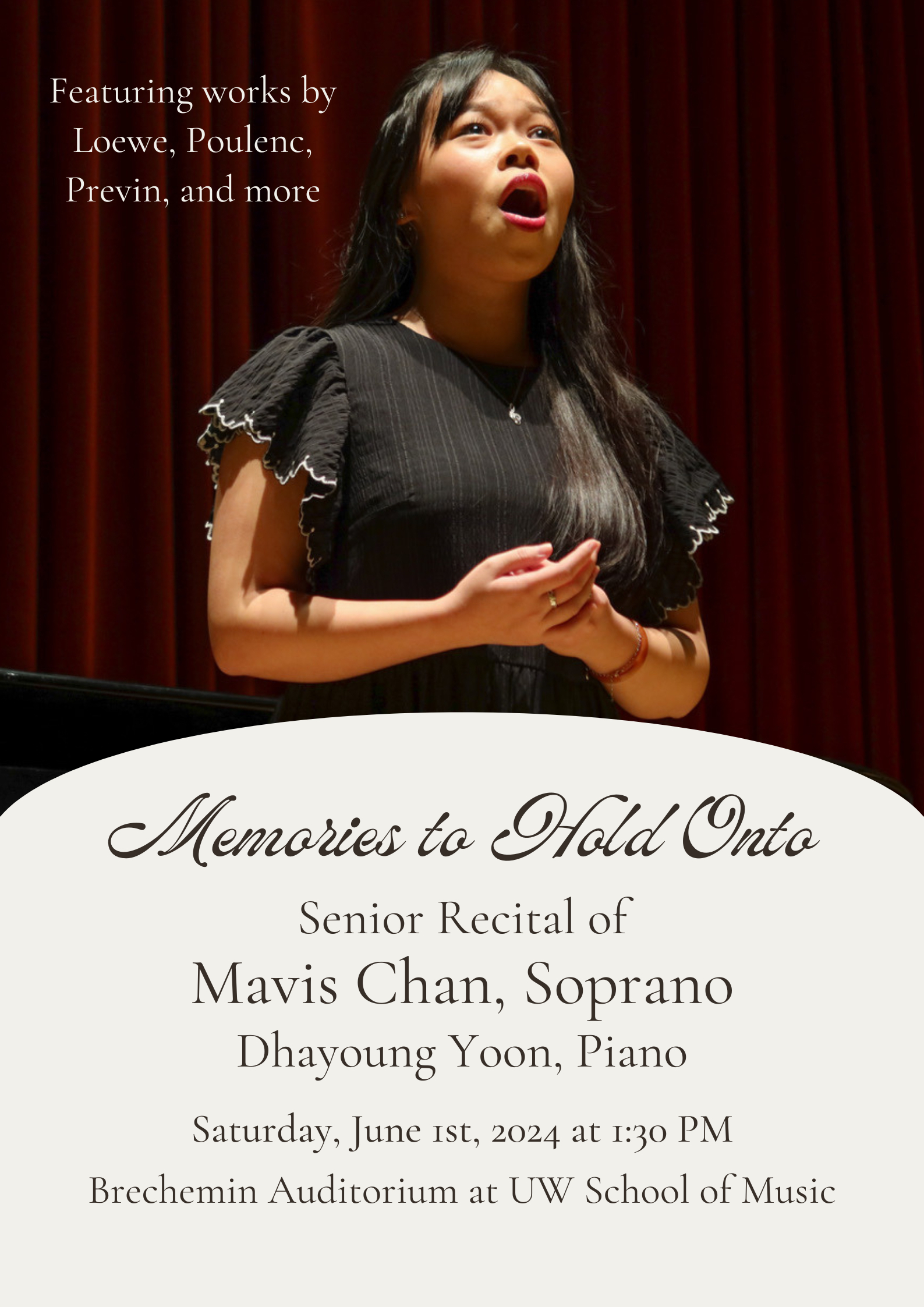 Saturday, June 1 2024, 1:30pm Brechemin Auditorium FREE Mavis Chan (BM, Voice), a student of Dr. Carrie Shaw, presents a senior degree recital, "Memories to Hold Onto," performing works from Loewe, Poulenc, Previn, and others. With Dhayoung Yoon, piano. Event Type Degree Recitals Performances Student Activities and Performances Related Areas of Study Vocal Performance Voice Program