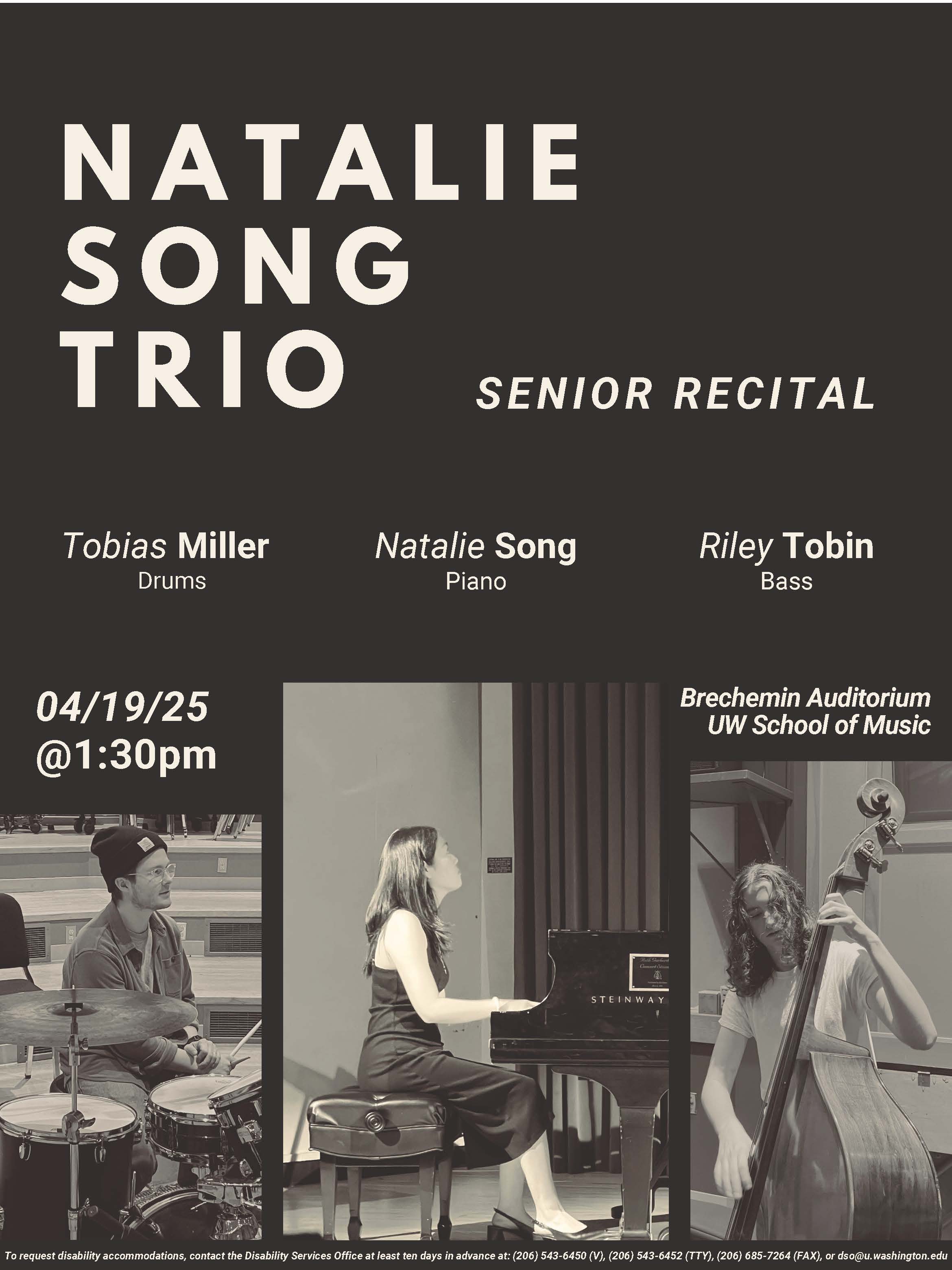 Natalie Song (BM, Jazz Studies), a student of Ted Poor, presents her senior recital, a performance by the Natalie Song Trio—Natalie Song (piano), Riley Tobin (bass), and Tobias Miller (drums). With Cole McKittrick, guitar.