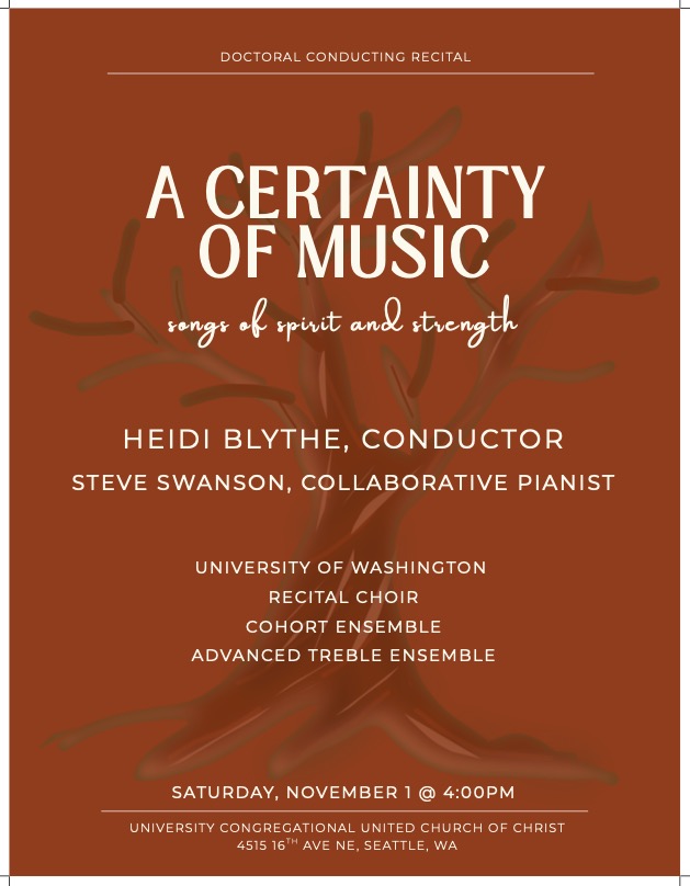 Heidi Blythe (DMA, Choral Conducting) presents "A Certainty of Music," a degree recital featuring songs of spirit and strength performed by the UW Recital Choir, UW Cohort Ensemble, and the UW Advanced Treble Ensemble. With Steve Swanson, collaborative pianist.