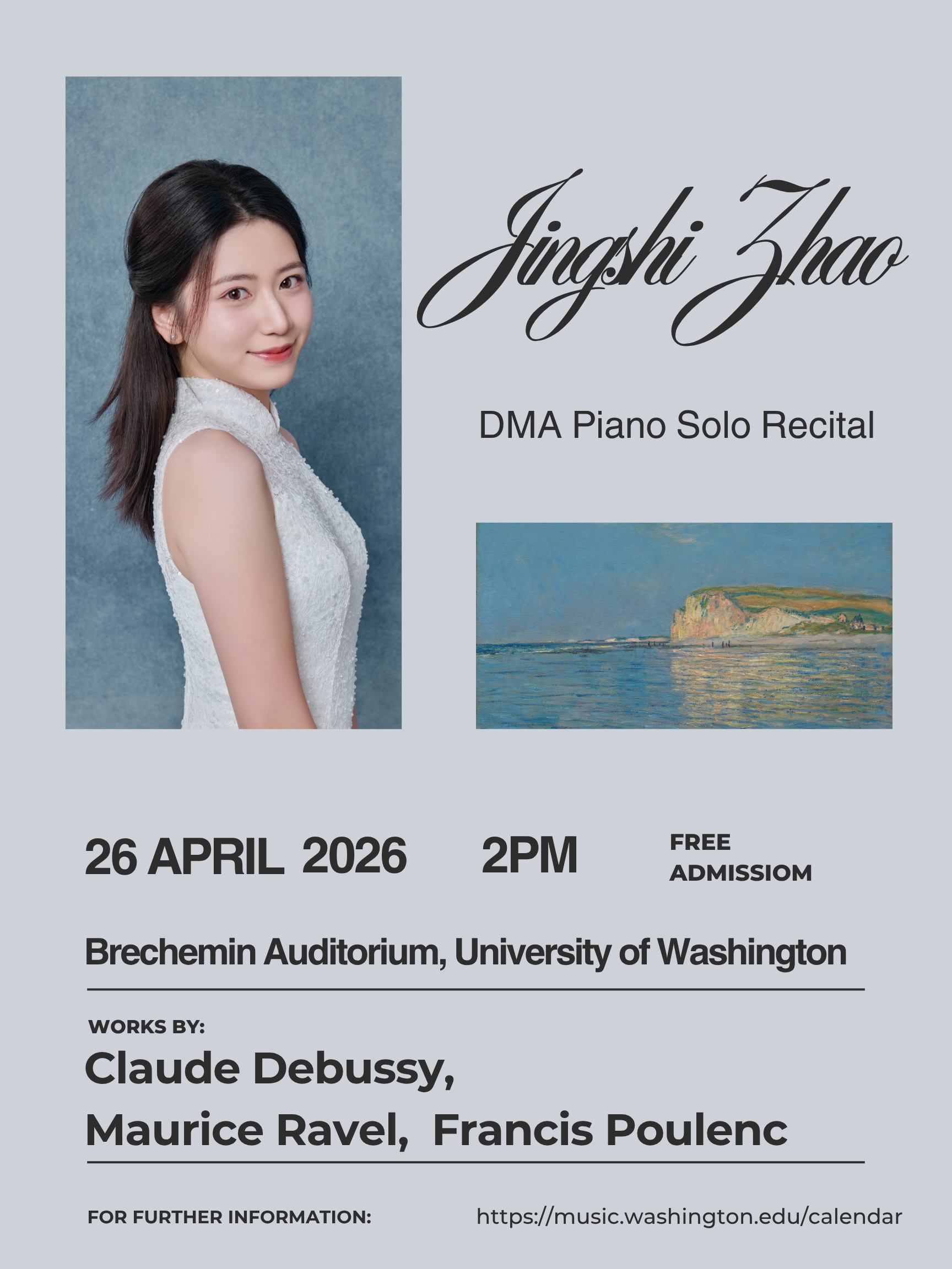 Jingshi Zhao (DMA, Piano), a student of Craig Sheppard, performs works by Debussy, Ravel, and Poulenc in her graduate degree recital.