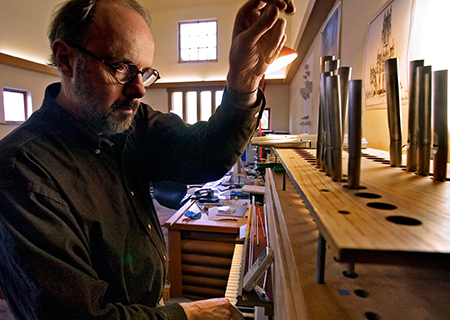 Paul Fritts "voices" an organ being built in his shop, making subtle adjustments to achieve the desired sound. Media credit: Courtesy of Paul Fritts & Co. Organ Builders