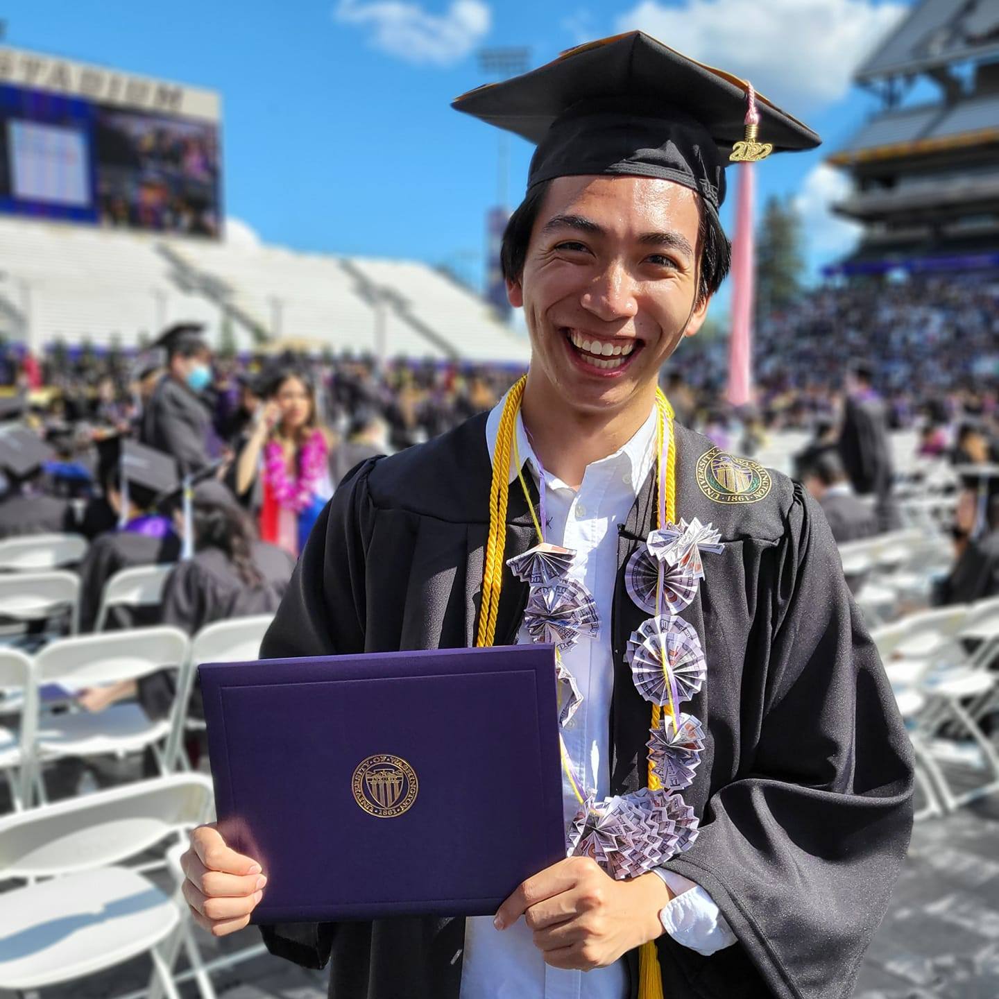 That was School of Music graduate Alexander Nam Nguyễn (’22 BM, Music Education) at the UW’s 2022 Commencement ceremony, leading College of Arts and Sciences undergraduates into Husky Stadium as one of six banner carriers, or gonfalonieres, representing the College. Nguyễn was recognized for exemplifying the College’s core values of excellence, inquiry, community, accountability, integrity, and citizenship.